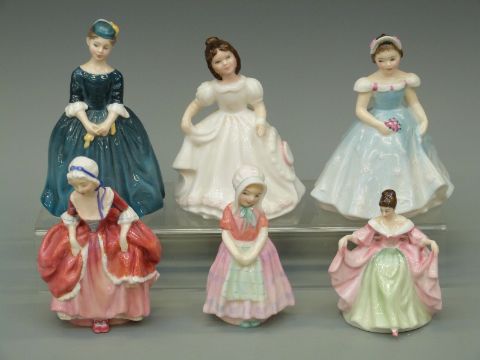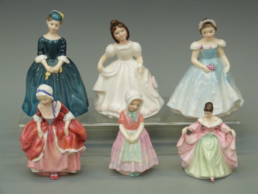 Six Royal Doulton small figurines including Amanda, Tootles, Sara, Goody Two Shoes etc, largest approximately 16cm tall