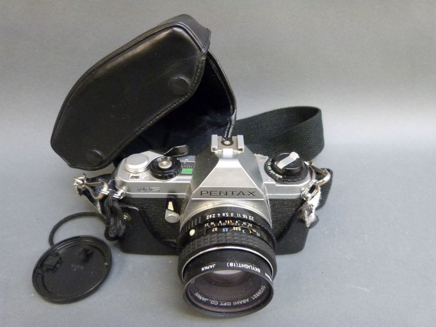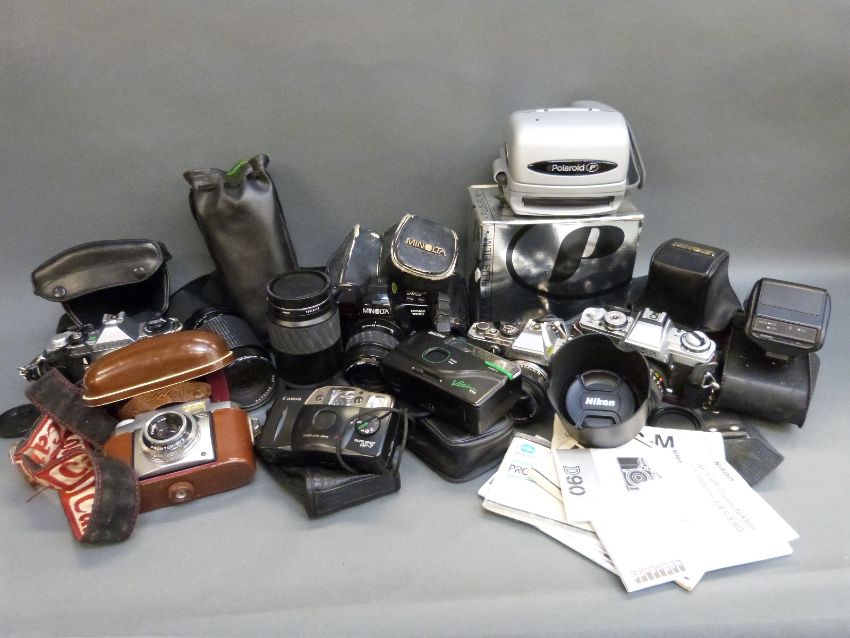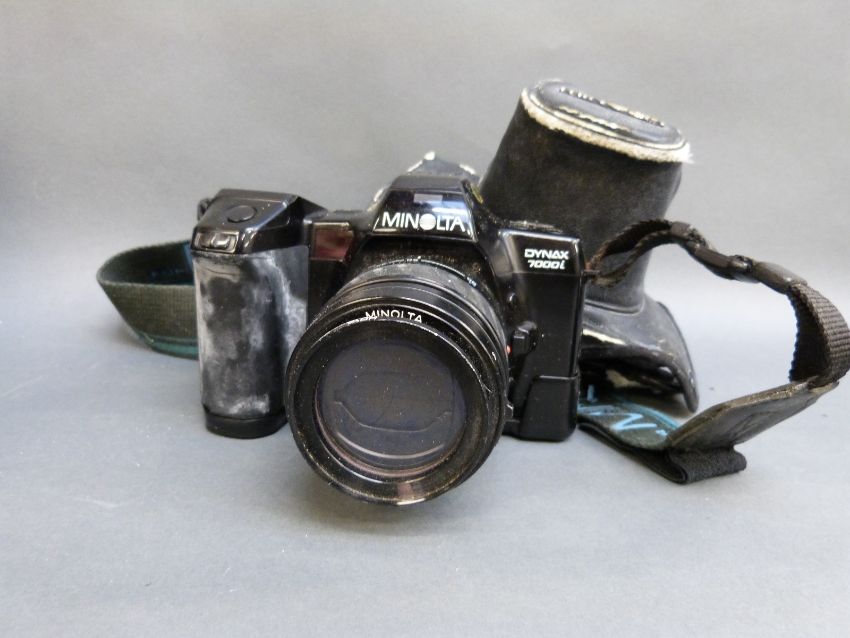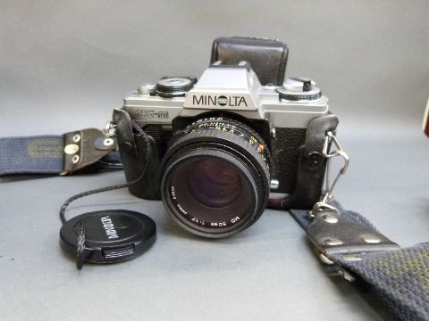 A quantity of SLR cameras to include Minolta XG-M with 1:1.7 50mm lens, Minolta Dynax 7000i with 35-80mm and 100-300mm lenses, Tokina 50-200mm 1:3.5-4.5 lens, Pentax M G with 1:2 50mm lens, Olympus OMIO with 1:1.8 5mm lens, various further cameras, accessories etc