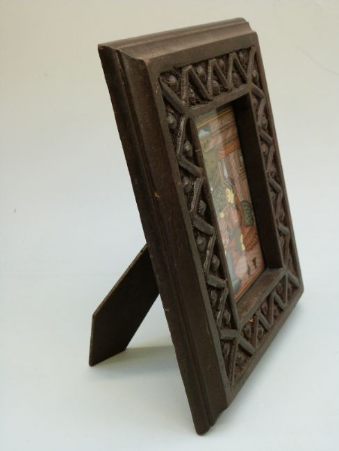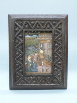 A framed Indian Moghul style miniature on paper of a couple on a balcony, 14 x 9cm