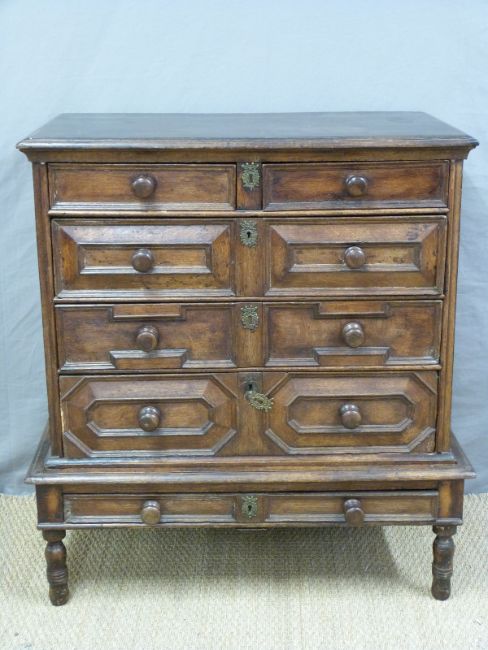 An 18thC oak chest of five drawers on stand in the Carolean style, H110 x W97 x D55cm