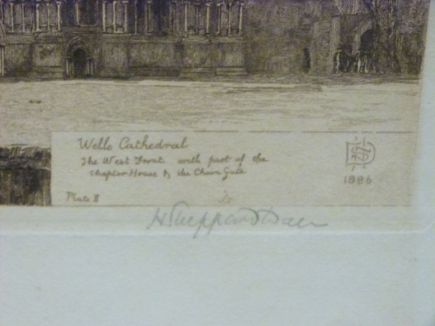 Portfolio containing three engravings of Wells Cathedral signed Henry Sheppard Dale, signed