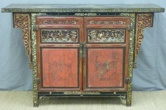 A 19th/early 20thC Chinese altar cabinet with carved and lacquered decoration , H112 x W170 x D48cm