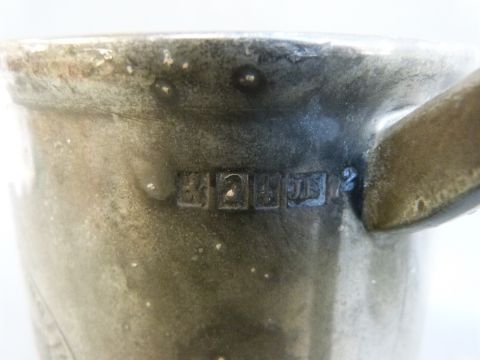 A pair of pewter loving cup trophies with Eton College coat of arms, both awarded to E R S Bloxsome and dated 1872, 15.5cm tall.