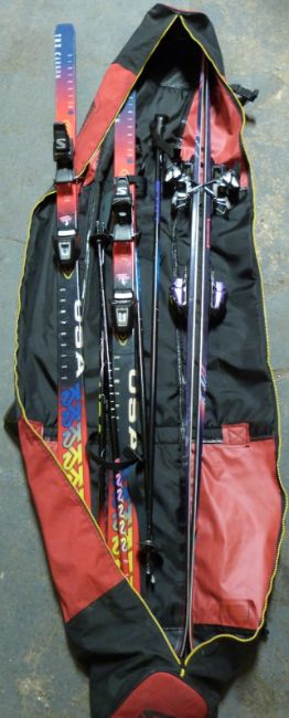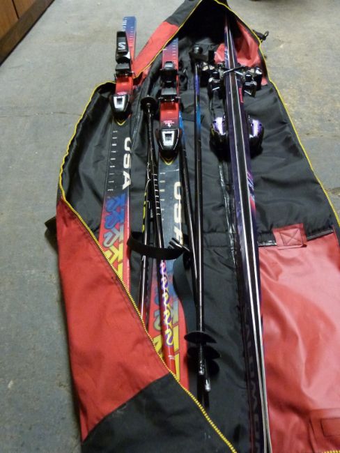 Two sets of skis and poles, Sidecut 7.9 TRX carbon and Evolution 7000 slalom skis, all in a zip up ski bag