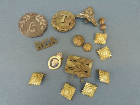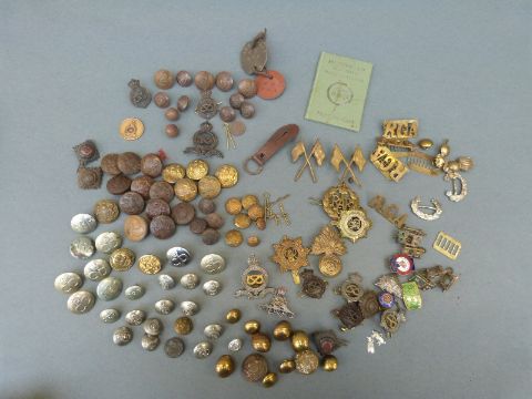 A quantity of WWI militaria relating to 2nd Lieutenant E E Keen RGA, including three sets of dog tags, buttons, cap badges, hallmarked silver and enamel sweetheart brooch etc