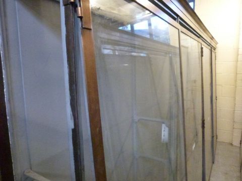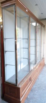 Ex Victoria & Albert Museum early 20thC four door glass display cabinet with bronzed frame, on mahogany base with provision for four fall flap doors, the cornice with impressed letters V,W,X,Y, the cabinet cut in two for transportation. Provision for twelve shelves, some adjustable. Suitable for shop fitting, haberdashery or museum display use. With approximately 10 glass shelves H240 (on base) x L375 x D47cm (on base)PLEASE SEE IMPORTANT NOTICE ON LOT 1750 BEFORE BIDDING
