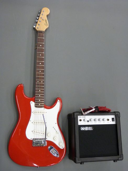 Encore electric rhythm guitar in red lacquered finish complete with an Acoustic Solutions GA-20W practise amplifier, soft case and accessories