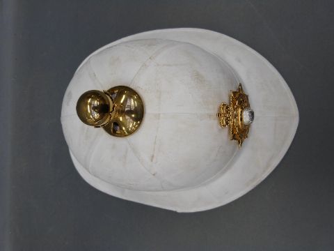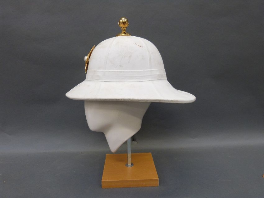 A Royal Marines officer's topee with gilt metal finial, 'Per Mare Per Terrem' badge, leather interior and brass clips for a chin strap