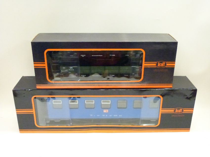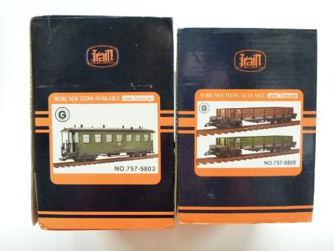 Three Train G gauge wagons and a coach, 757-5805 and 757-5803, in original boxes.
