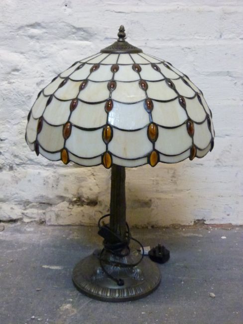 A Tiffany style table lamp and a further gilt example with geometric glass shade, height of taller 82cm