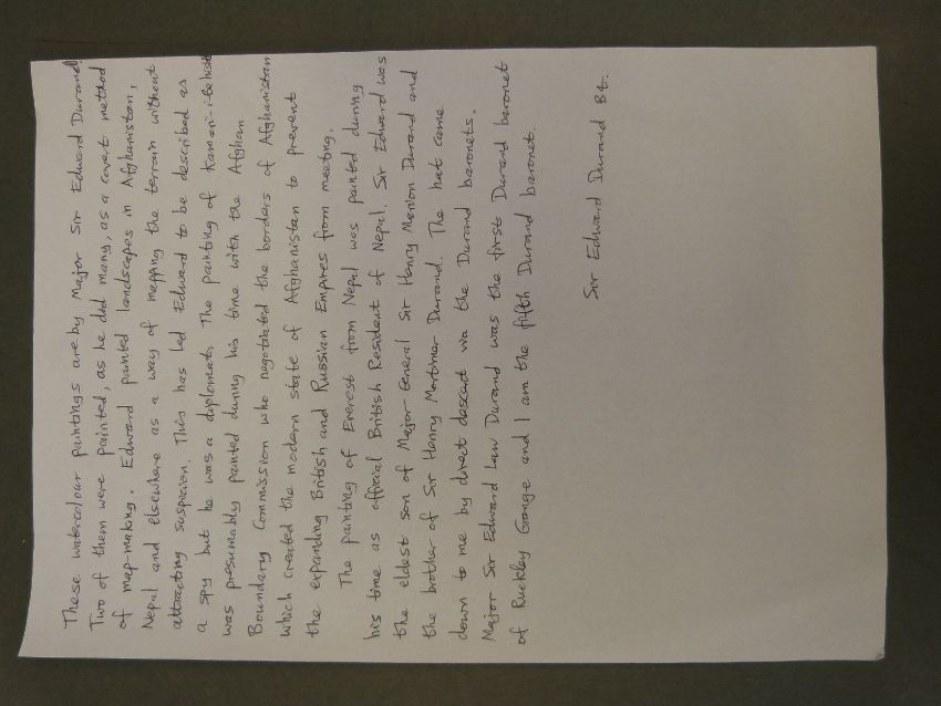 Major Sir Edward Law Durand 19thC watercolour Afghan mountains, horses and riders at rest, 15 x 24cm.Probably painted by Sir Edward during his time with the Afghan Boundary Commission as a covert way of map making without attracting suspicion. With photocopy letter of provenance, sold by a direct descendant