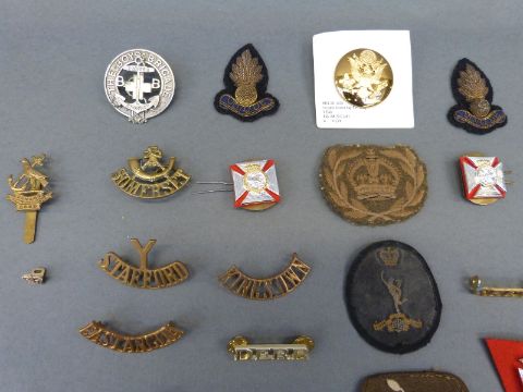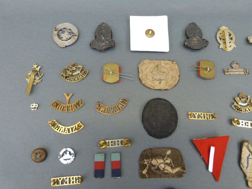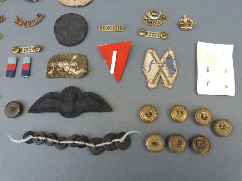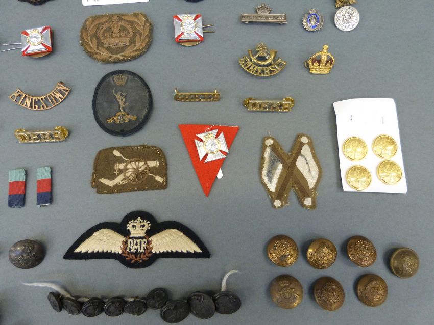 A quantity of military badges and insignia including British West Indies regiment example marked sterling silver, buttons, shoulder titles, American items, steady HMS Hood cap badge etc