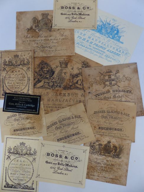 A quantity of reproduction gun labels including Thomas Jackson, John MacPherson, Holland & Holland, W Richards, Egg, Boswell, E J Churchill etc