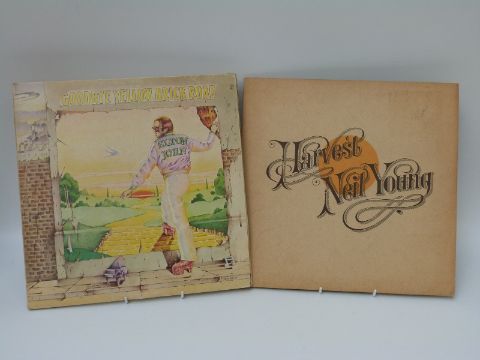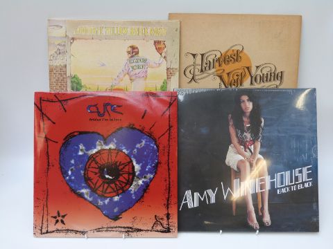 The Cure Friday I'm in Love 12" multi coloured vinyl, Amy Winehouse Back to Black (sealed), Elton John Goodbye Yellow Brick Road, yellow vinyl and Neil Young Harvest White, cream vinyl