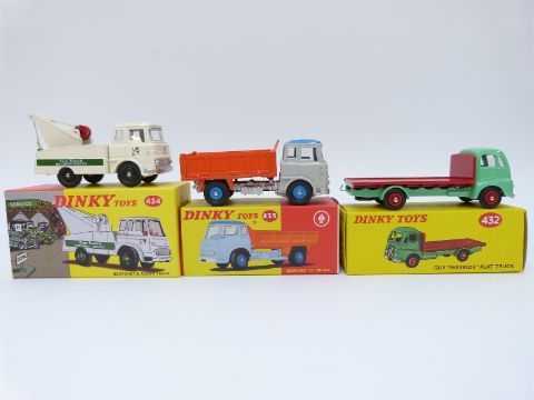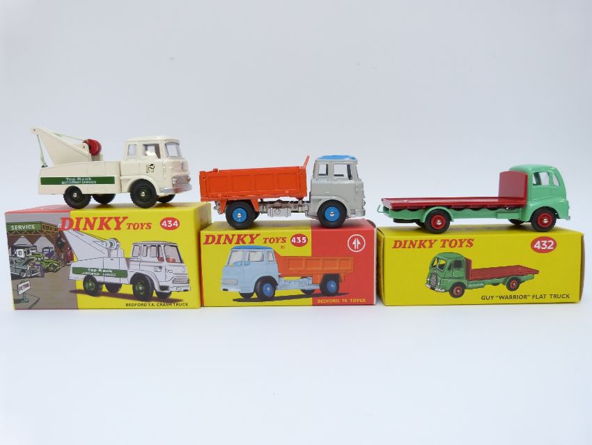 Three Atlas Editions Dinky Toys diecast model commercial vehicles comprising Guy Flat Truck 432, Top Rank Bedford TK Crash Truck 434 and Bedford TK Tipper 435, all in original boxes.
