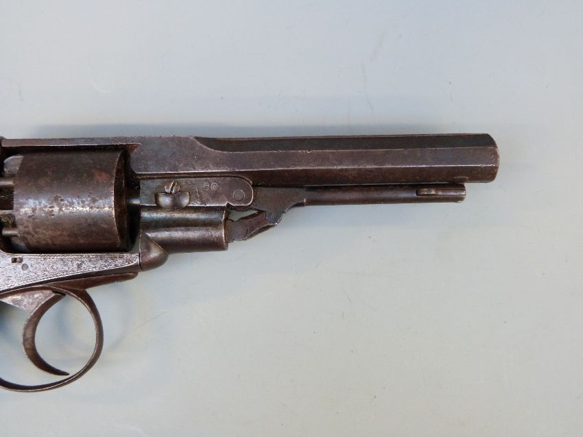 Davies 80 bore five-shot percussion revolver with engraved frame marked 'Patent 1274' in banner, chequered grip and 5 inch part octagonal barrel, overall length 27cm.