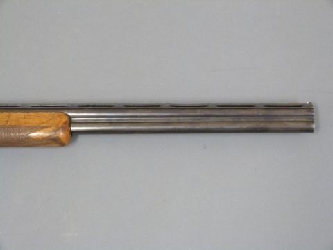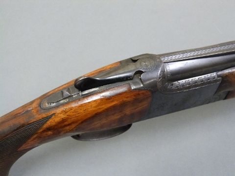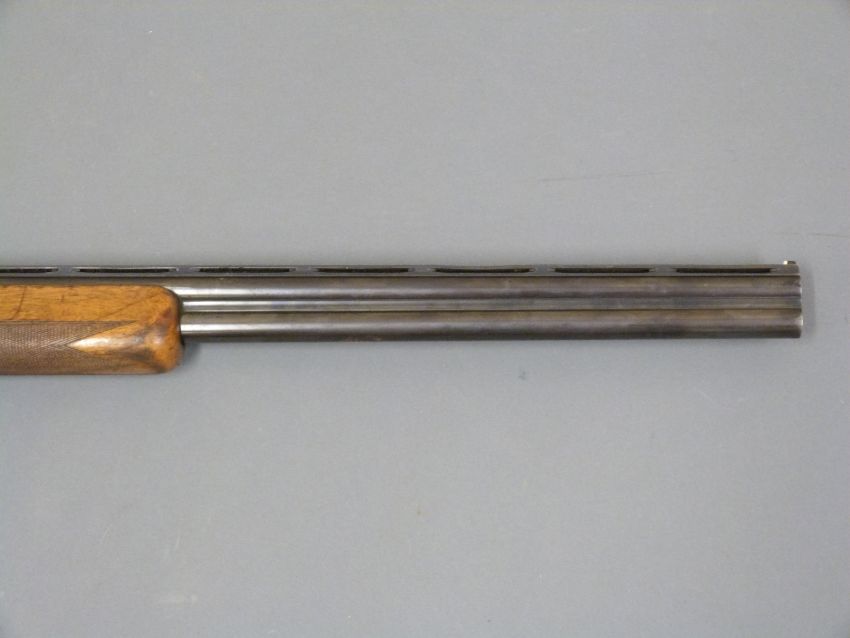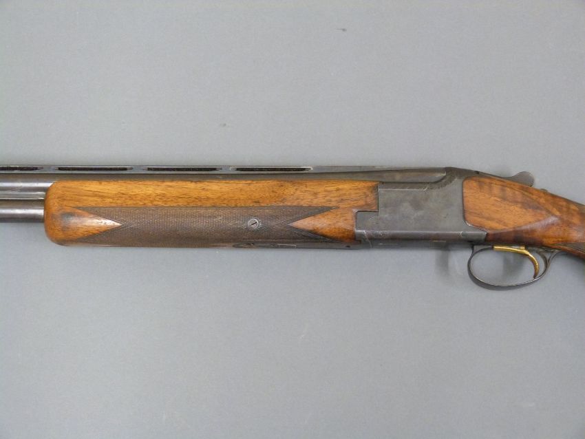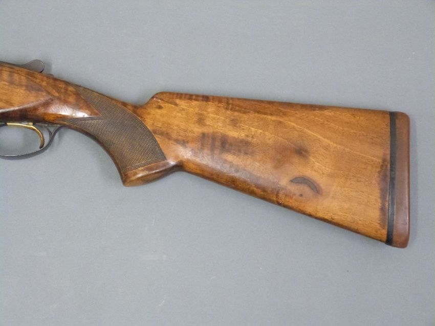 Browning 12 bore over and under ejector shotgun with engraved locks, top lever, underside and trigger guard, chequered semi-pistol grip and forend, single gilt trigger, raised white dot foresight, vented top rib and 27.5 inch barrels choked 1/4, overall length 112.5cm, length of pull 35cm, serial number 28008570. PLEASE NOTE THAT A VALID RELEVANT FIREARMS/SHOTGUN CERTIFICATE IS REQUIRED TO HANDLE/PURCHASE THIS ITEM.