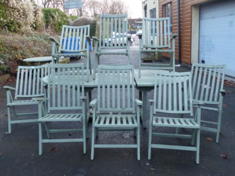 A teak garden set including oval extending table and eight reclining chairs, large parasol, eight cream and green full length cushions, max length 240cm