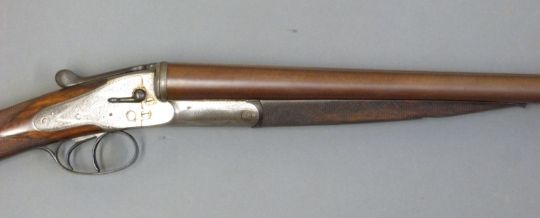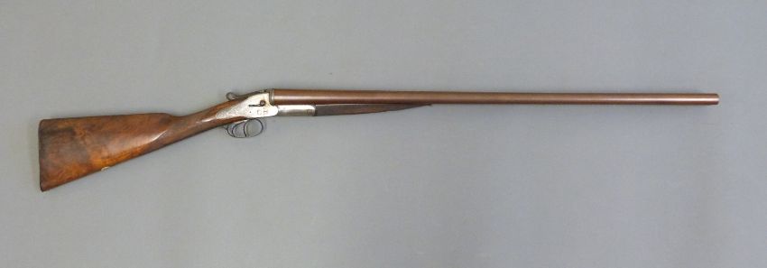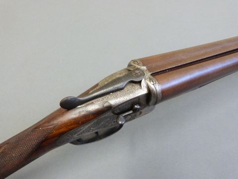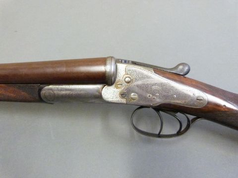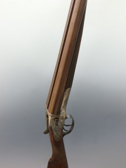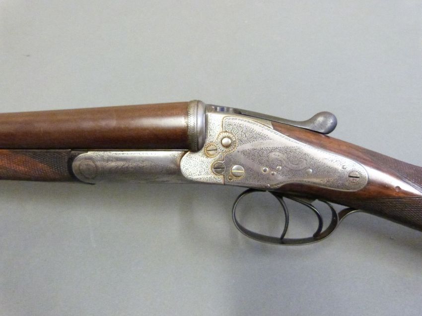 George Gibbs of Bristol 12 bore side by side sidelock shotgun with named and engraved locks, all over scrolling engraving, double trigger, chequered grip and horn tipped forend, inlaid cartouche to the underside of the stock and 30 inch named Damascus barrels 1/2 and unchoked, overall length 117cm, length of pull 35cm, NVSN. PLEASE NOTE THIS GUN IS BEING SOLD AS STOCK AND ACTION ONLY AND A VALID RELEVANT FIREARMS/SHOTGUN CERTIFICATE IS REQUIRED TO HANDLE/PURCHASE THIS ITEM.