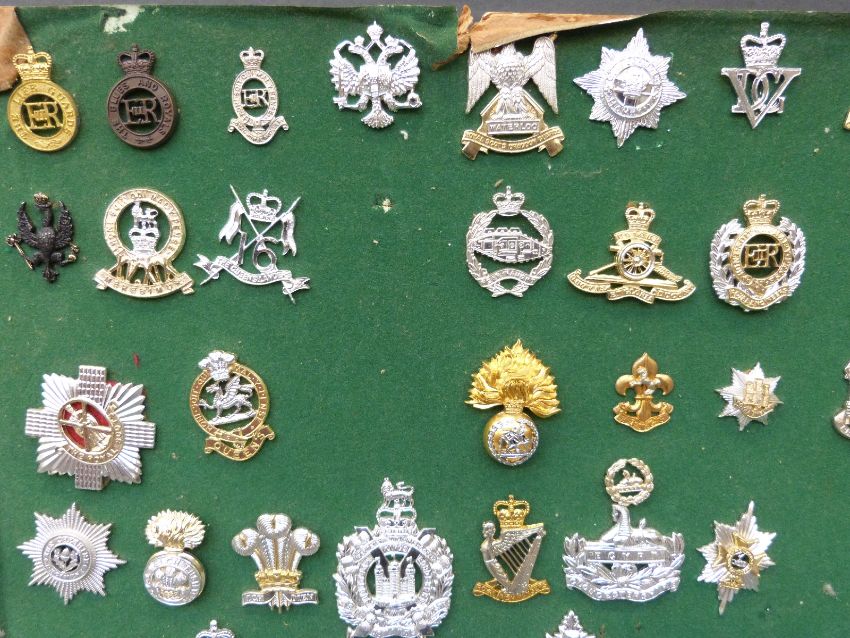 A display 65 of post WWII military cap and other badges including RAEC, Royal Army Veterinary Corps, Chaplain etc