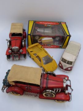 Five large scale diecast model vehicles Microbus, Burago Lamborghini Diablo, Burago Mercedes-Benz SSKL 1931 (in original box) and two others