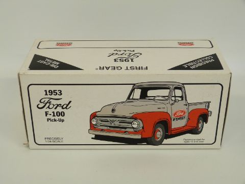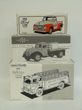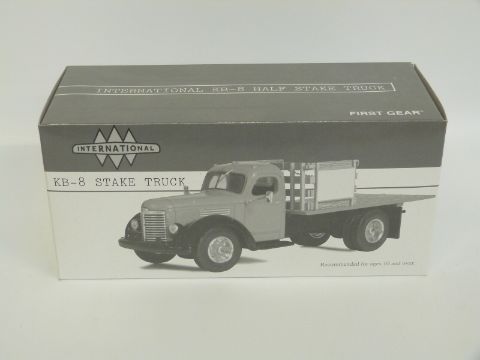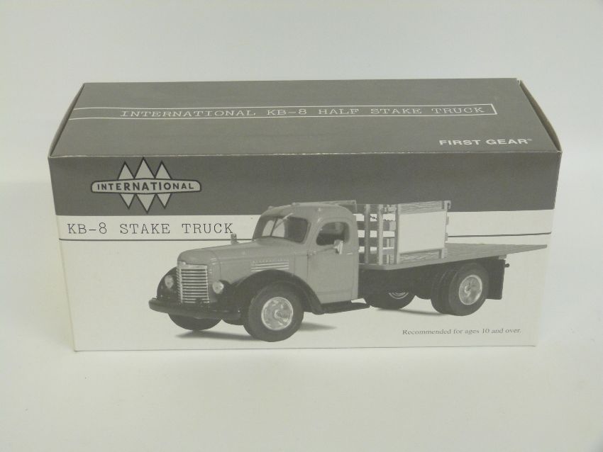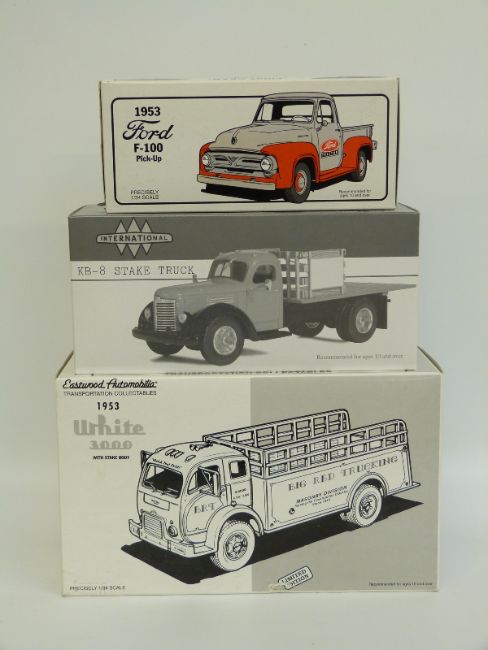 Three First Gear 1:34 scale diecast model commercial vehicles comprising limited edition Eastwood Automobilia 1953 White 3000 with Stake Body, International KB-8 Stake Truck and 1953 Ford F-100 Pick-Up, all in original boxes