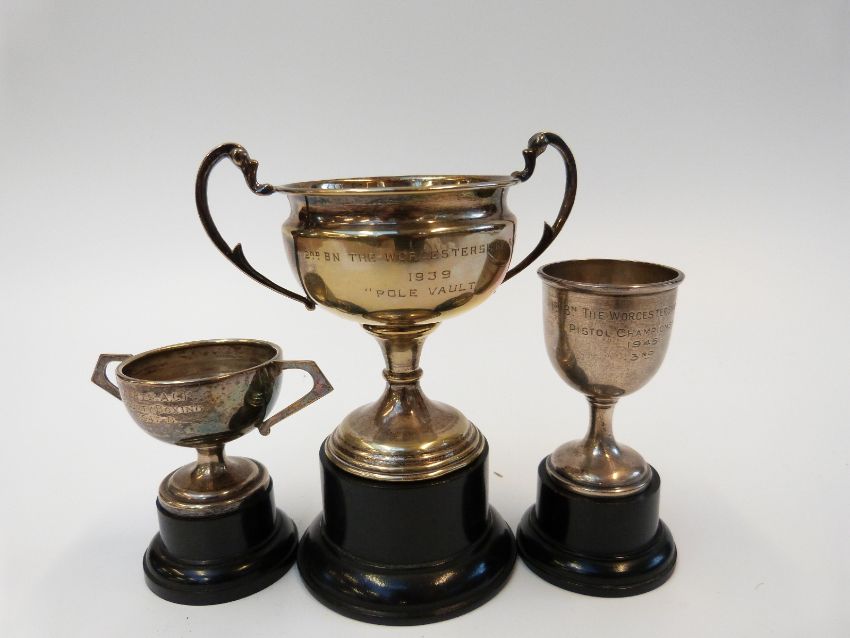 Three Worcestershire Regiment and other interest trophy cups to include hallmarked silver example 1st Bn The Worcestershire Regt. Pistol Championship 1945 3rd, plated 2nd Bn The Worcestershire Regt. 1939 Pole Vault and one other, all on bases, height 15.5cm