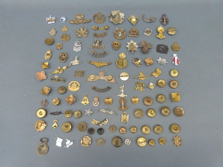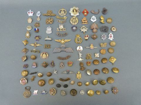 A quantity of military badges and insignia including County of London Cyclists 25, hallmarked silver ARP badge, Northamptonshire, RAF and other sweetheart brooch, dispatches oak leaf, buttons etc