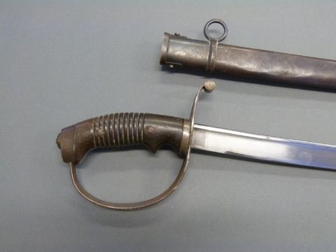 Prussian 1889 pattern trooper's cavalry sword with ribbed composite angle pistol grip, plain guard marked 53A and blade marked Carl Eickhorn Solingen, 79cm with steel scabbard