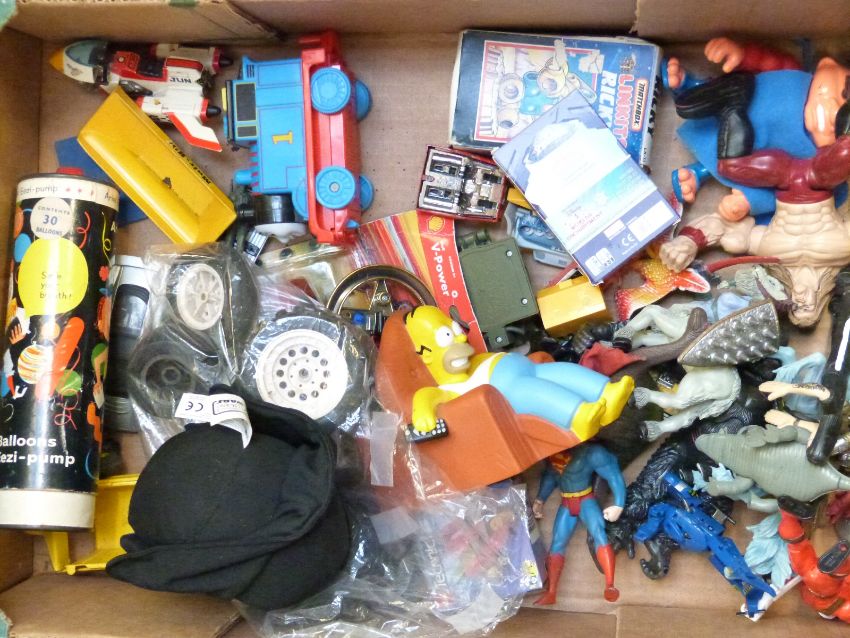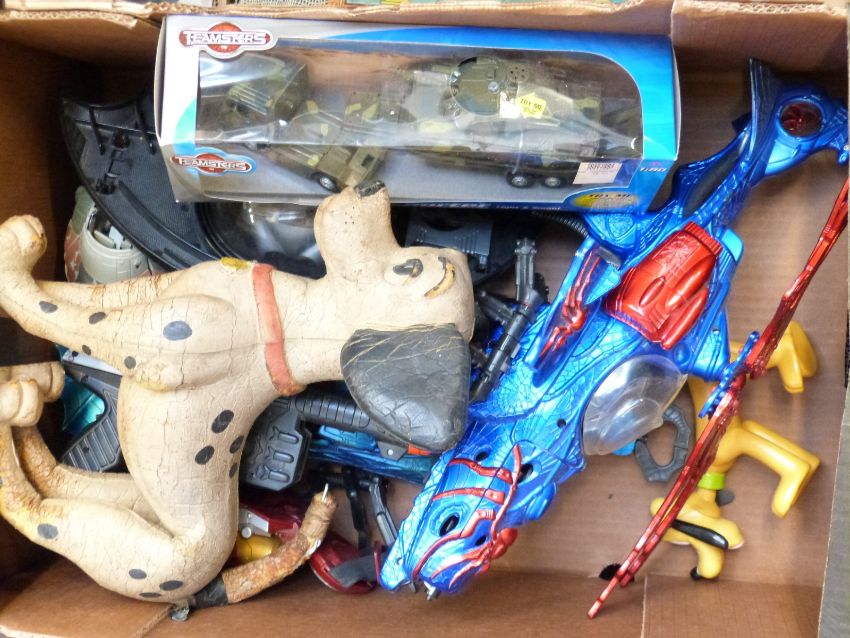 A large collection of action figures, vehicles and similar toys including Spiderman, Star Wars, Planet Of The Apes, Micro Machines, Disney Cars, Minions, Teksta Robotic Puppy, Girder & Panel Action Building Set, some in original boxes