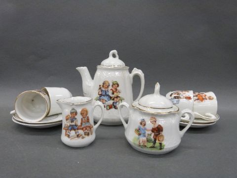 A collection of ceramics including boxed Royal Doulton Nisbet doll, children's bowls, children's tea set, dolls furniture, miniature teddy bear etc