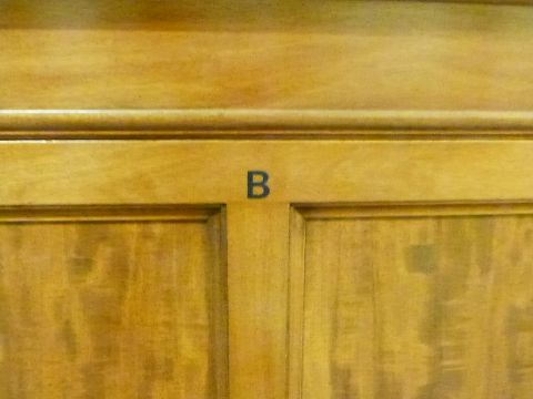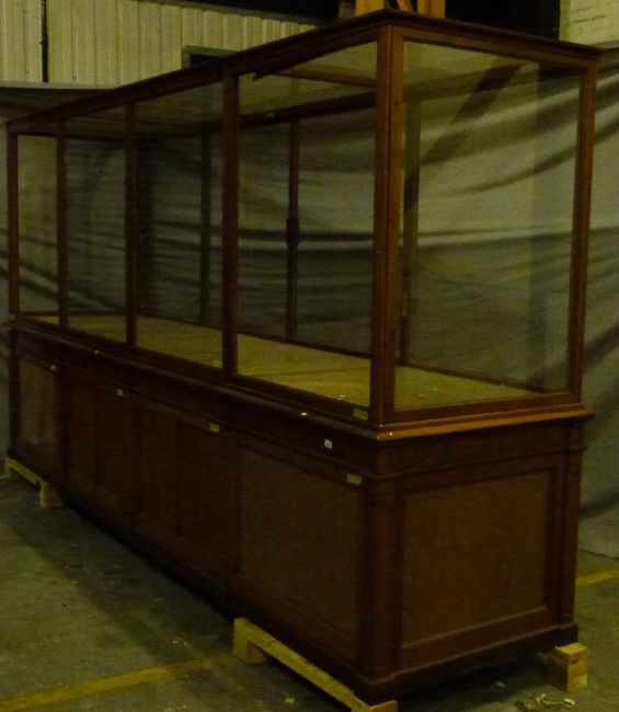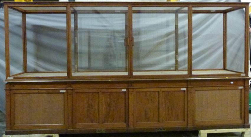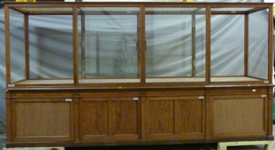 Ex Victoria & Albert Museum early 20thC mahogany four bay glass display cabinet with glazed upper section and ceiling panels, lockable hinged double doors to either side and single doors to both ends. The base section with an arrangement of two glazed spaces with wooden panels fitted behind the glass, each with two hinged lockable drawers. The central cabinet space with a pair of hinged lockable doors either side. The base with breakfront column decoration, four doors impressed A, B, C, D and six decorative bronze or brass air grilles, impressed no 59 to both sides, suitable for shop fitting, haberdashery or museum display use. H1945 x L3720 x D900cmPLEASE SEE IMPORTANT NOTICE ON LOT 1750 BEFORE BIDDING