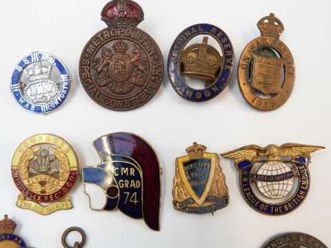 A collection of military enamel and other badges to include Worcestershire Old Comrades and Rats of Tobruk and BSAS War Comforts together with two silver war badges numbered B258170 and 384114, two WWI 'On Service' badges numbered 423377 1916 and 24203 1915, Home Guard, National Reserve etc