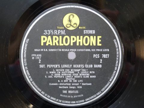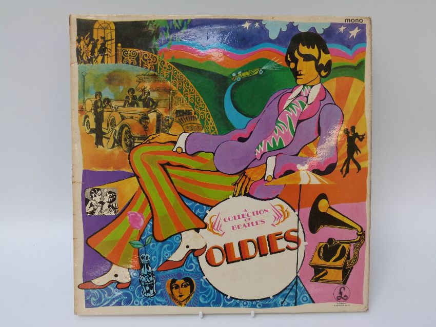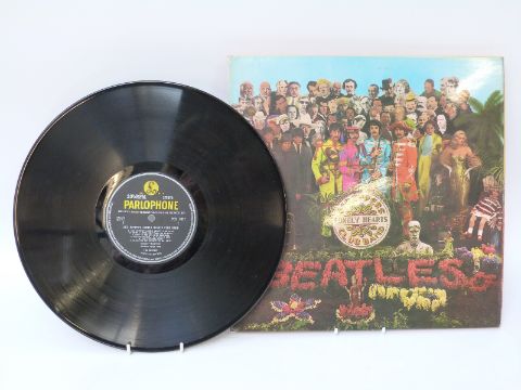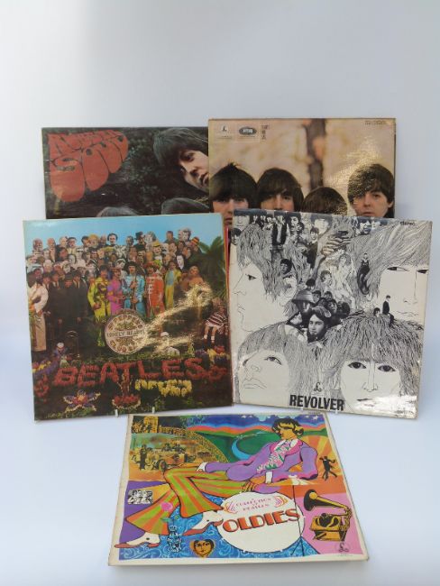 Five The Beatles albums on yellow/black Parlophone, in excellent condition comprising Sgt.Pepper (stereo, wide spine with cut outs and strawberry sleeve) Revolver (stereo) Rubber Soul (mono) For Sale (mono) and Oldies (mono)