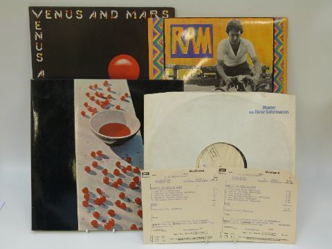 Paul McCartney / Wings albums comprising McCartney, Ram with 'Factory Sample Not For Sale' stickers (UK), Venus and Mars - German white label test pressing, excellent. At The Speed of Sound - German white label test pressing with info, no cover excellent, property of ex-EMI manager