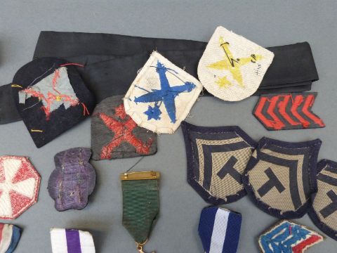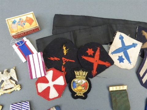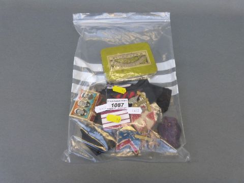 A quantity of militaria including cap badges for Notts & Derby, West Riding, Buffs etc, St John's Ambulance, fabric badges, replica medals etc
