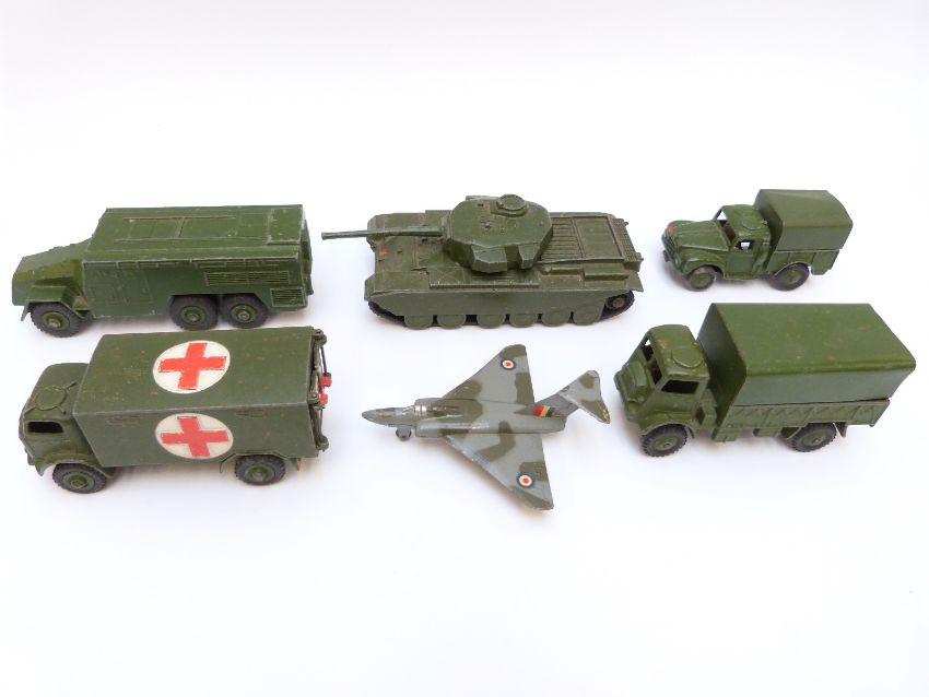 Seventeen Dinky Toys and Britains diecast model military vehicles including tanks and aeroplanes