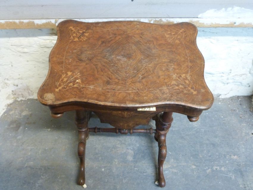 A 19thC burr walnut sewing or work table with quarter veneered and inlaid decoration, W53 x D40 x H70cm