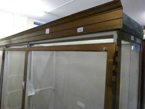 Ex Victoria & Albert Museum early 20thC four door glass display cabinet with bronzed frame. The cornice with impressed C2,D2,E2,F2 the cabinet cut in two for transportation. Provision for twelve shelves, some adjustable. Suitable for shop fitting, haberdashery or museum display use. With approximately 10 glass shelves H186 x L370 x D39cmPLEASE SEE IMPORTANT NOTICE ON LOT 1750 BEFORE BIDDING