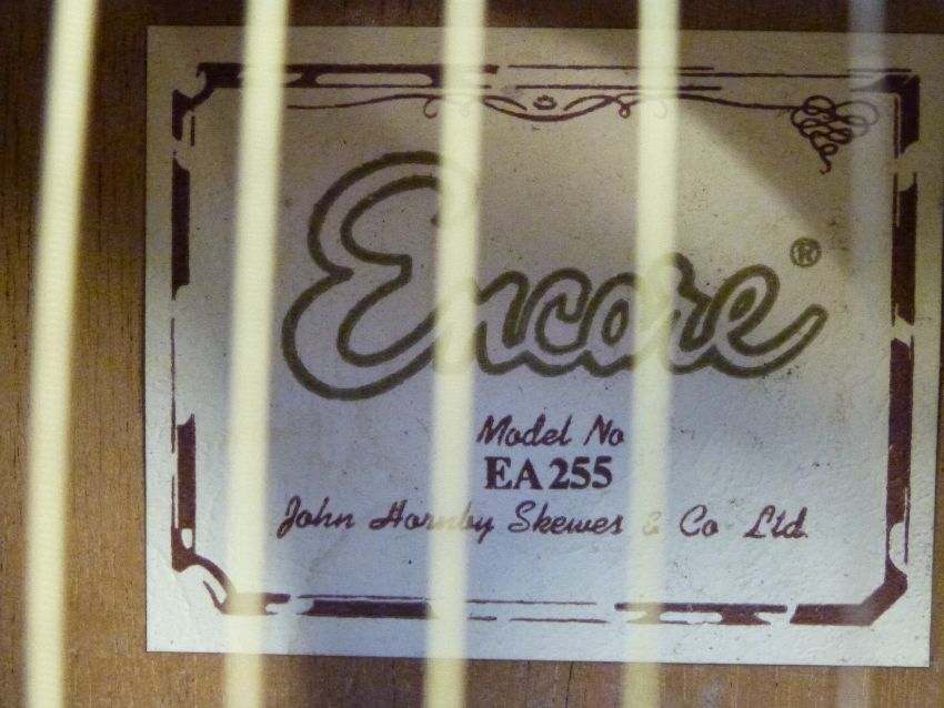 Encore model EA255 acoustic guitar with six steel strings, adapted with electric pick up