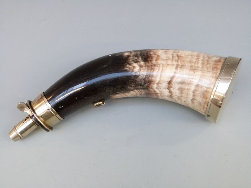 G & J W Hawksley horn powder flask with white metal mounts and suspension loop, 28cm long