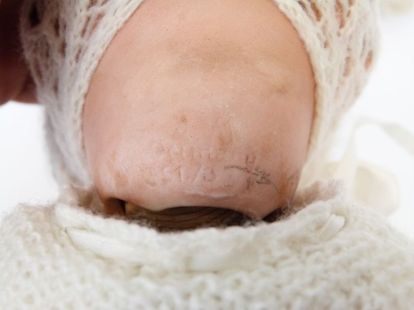 Armand Marseille bisque headed doll with open mouth, weighted blue eyes, jointed limbs and composite body, marked to the back of the neck AM Germany 331/3, in knitted clothes, 33cm tall