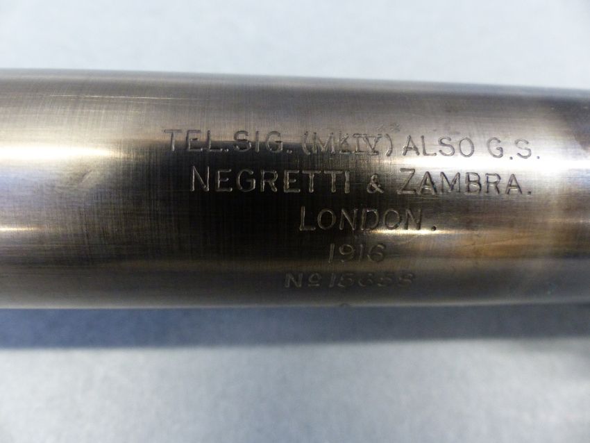 Negretti & Zambra WWI three draw military telescope marked Tel Sig (MK IV) and GS, Negretti & Zambra London 1916 No 15658 and broad arrow, in leather case with low and high eyepieces