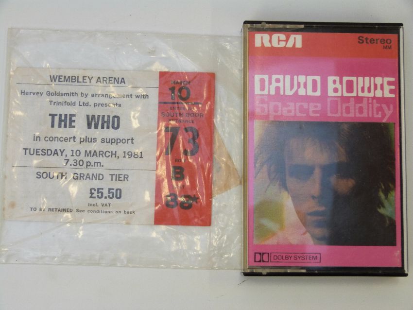 Davy Jones and the Lower Third EP - reissue on EMI - demo David Bowie, Space Oddity cassette, Glass Spider tour programme Dana Gillespie single, Roy Orbison 1977 tour programme and a Who ticket (Wembley Arena 1981)