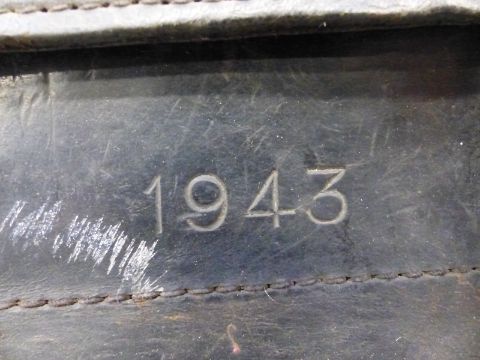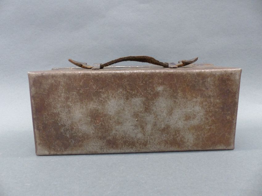 WWII military motorcycle tool box with embossed date 1943 and ministry arrow, 27 x 9 x 12cm