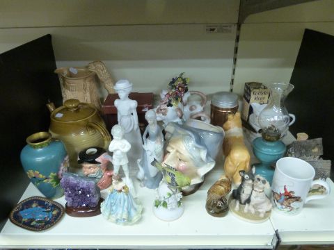 A collection of ceramics including Spode and Beswick examples along with cloisonne pieces, amethyst, cow figures, possibly Basil Mathews