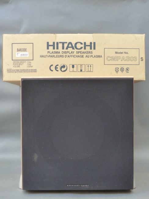 Mordaunt-Short Avant 309i digital sub-woofer speaker with built in variable notch filter, together with a pair of Hitachi plasma display speakers