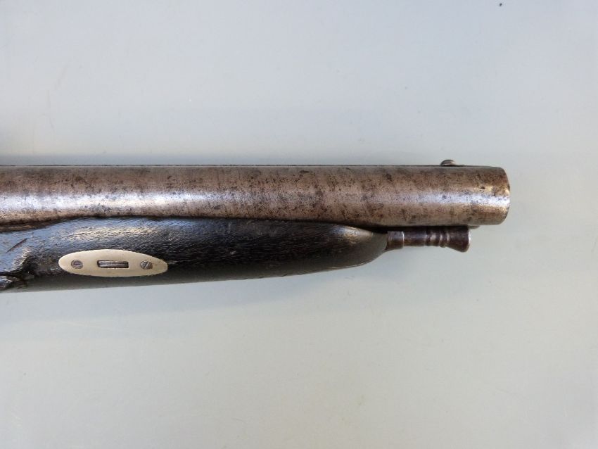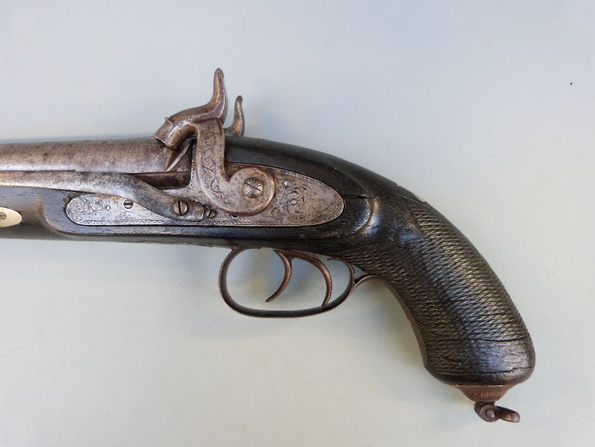 J H Kieser double barrelled side by side percussion hammer action howdah or officer's pistol with named and engraved locks featuring game birds, engraved stylised dolphin hammers, pineapple finialled trigger guard and butt plate, suspension loop, belt hook, steel ram-rod, double trigger, chequered grip, shield shaped wrist cartouche, front sight and 9 inch Damascus barrels, overall length 39cm.