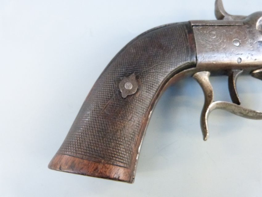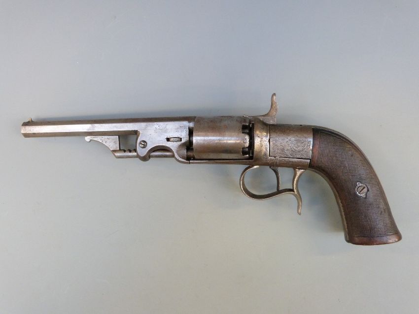 Belgian 80 bore six-shot percussion revolver with engraved lock, frame and spurred trigger guard, chequered grip, unusual toothed lever operated ejector rod and 6 inch octagonal barrel, overall length 33cm.