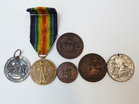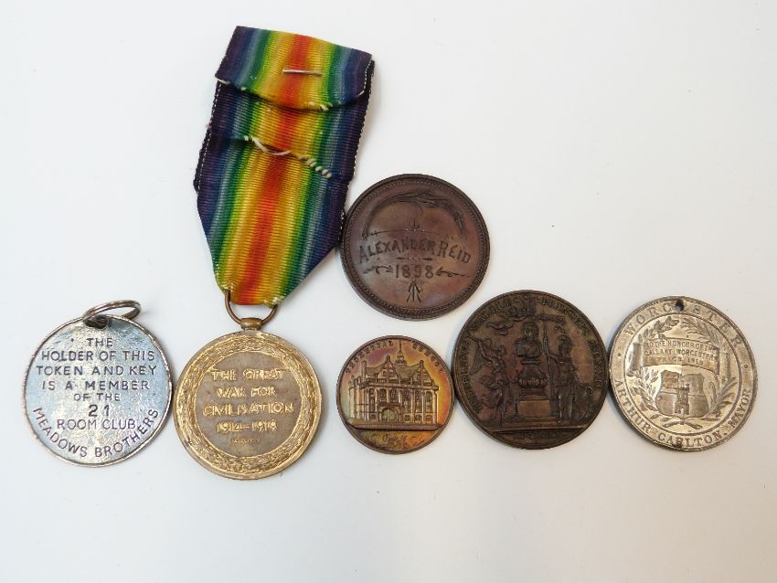 WWI War Medal awarded to Pte P J Dixon, 14 London Regiment together with a group of commemorative medals etc including a Worcester Peace Medal